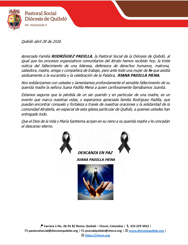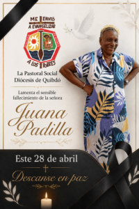 MENSAJE DE CONDOLENCIAS DE LA PASTORAL SOCIAL DIÓCESIS DE QUIBDÓ POR EL FALLECIMIENTO DE LA LIDERASA JUANA PADILLA